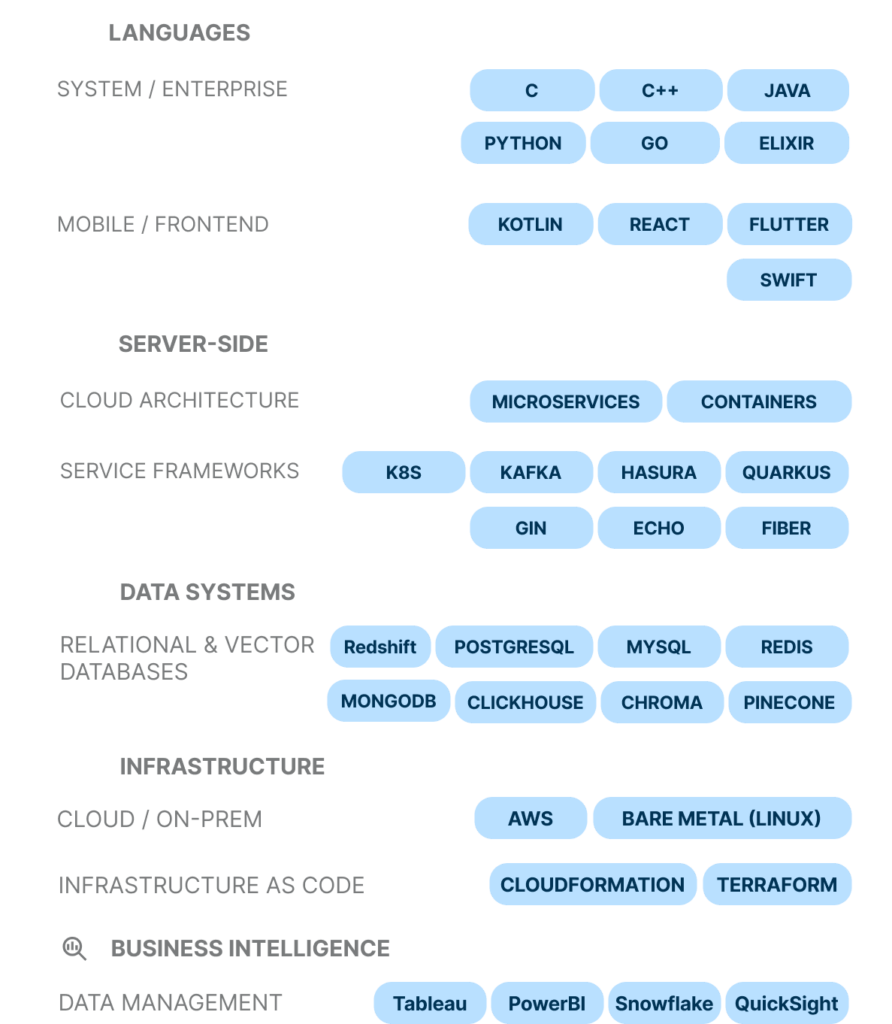 M10 Labs builds scalable, high-performance systems using modern, enterprise-grade technologies. Our engineering teams specialize in C, C++, Java, Python, Go, and Elixir for backend and system development, and Kotlin, React, Flutter, and Swift for intuitive mobile and frontend experiences. We architect robust server-side ecosystems with microservices, containers, and frameworks like Kubernetes, Kafka, Hasura, and Quarkus to ensure flexibility, resilience, and continuous delivery.