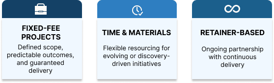 Each engagement model is built on transparency, agility, and measurable value, enabling enterprises to scale confidently while maintaining control, predictability, and delivery excellence.